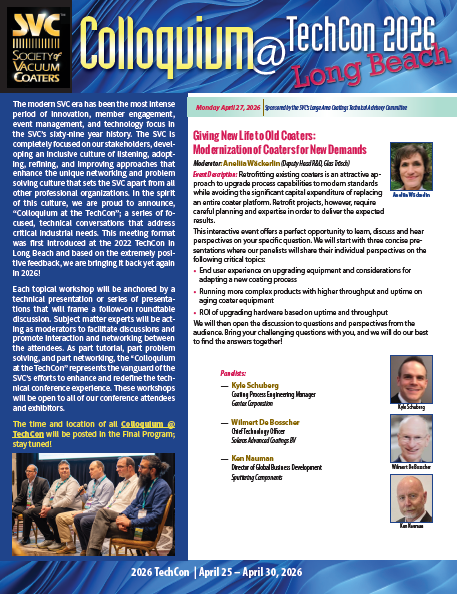 Registration is now open!!! Click here to register. Click here to submit an abstract for the 2026 Techcon Click here to view the latest version of the 2026 TechCon Extended Call for Papers as an interactive magazine Click here to view and download the latest version of the 2026 TechCon extended Call for Papers as an interactive PDF file Click here to view the 2026 TechCon Exhibit Prospectus as an interactive magazine Click here to view and download the 2026 TechCon Exhibit Prospectus as an interactive PDF file Click here to view and download the Colloquium Brochure as a pdf file Click here to view the current schedule grid Click here to register for the 110th IUVSTA-SVC Workshop on Advanced Plasma Diagnostics for Surface Engineering and Film Deposition 2024 Techcon video proceedings 2023 Techcon video proceedings 2022 Techcon video proceedings 2022-25 Techcon Photos 106th IUVSTA-SVC Workshop photos! SVC Foundation Website Return to SVC.ORG Sponsor Quick LInks Click here to view current job board